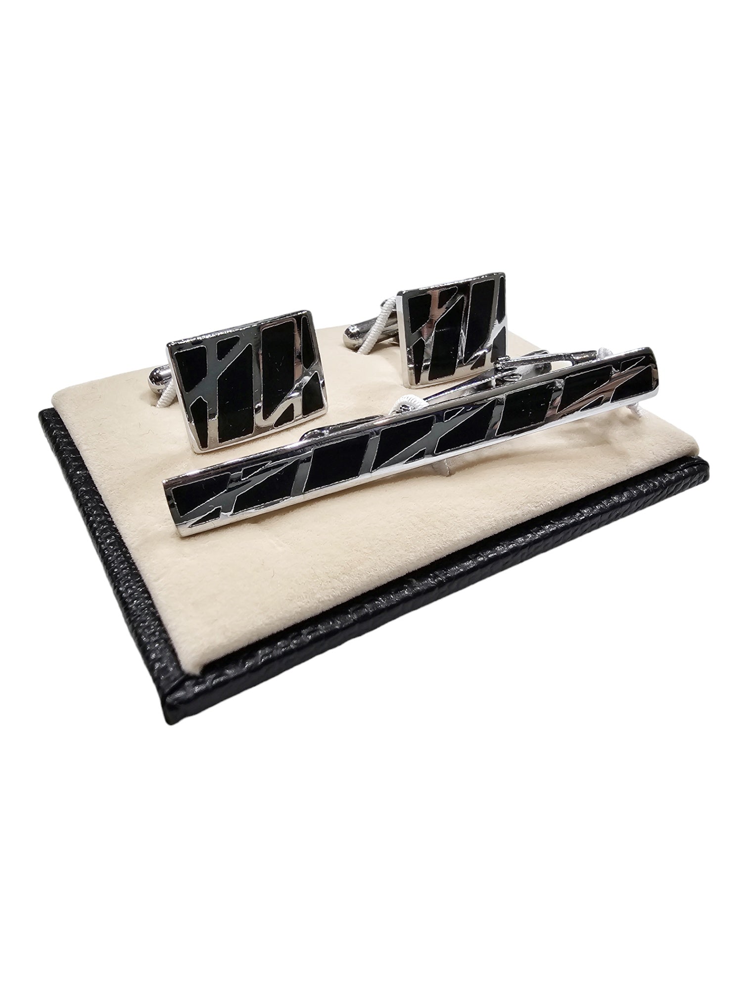 Valorizza il tuo look con questi eleganti gemelli e ferma cravatta in acciaio e smalto nero. Dotati di elevata resistenza e durata, ti permetteranno di tenere la cravatta ferma in modo impeccabile e di conferire un tocco di classe al tuo outfit.