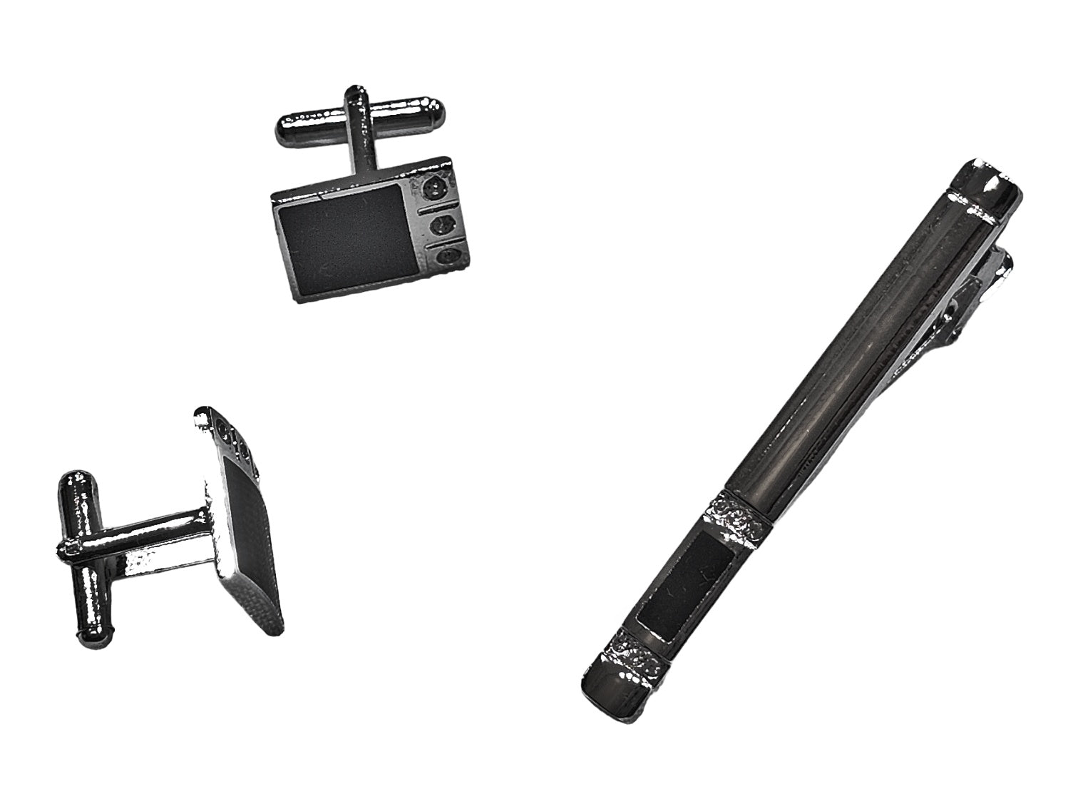 Questi eleganti gemelli e ferma cravatta sono perfetti per completare il tuo look formale. Realizzati in resistente acciaio e decorati con cristalli e smalto nero, garantiscono un aspetto sofisticato e professionale.